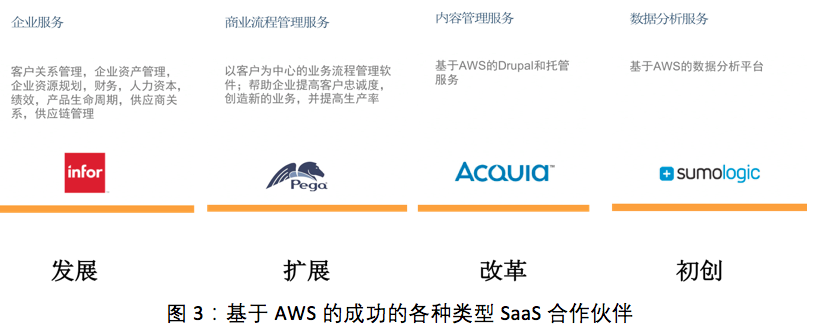 基于AWS平台的SaaS云服务的转型成功案例在全球都有分布,并有多种类型的SaaS合作伙伴提供各种类型的企业级软件。这些服务涵盖了企业软件服务,例如企业常用的客户关系管理(CRM)、企业资产管理(EAM)、企业资源规划(ERP)等软件;商业流程管理服务是以客户为中心的业务流程管理软件;内容管理服务为企业提供内部门户和内容整合的软件服务;数据分析服务基于AWS提供大数据分析服务的平台。同时这些SaaS合作伙伴也涵盖了各种类型,包括了由传统成功转型的、扩展业务发展而来的、通过改革创新而来的以及初创企业等等。