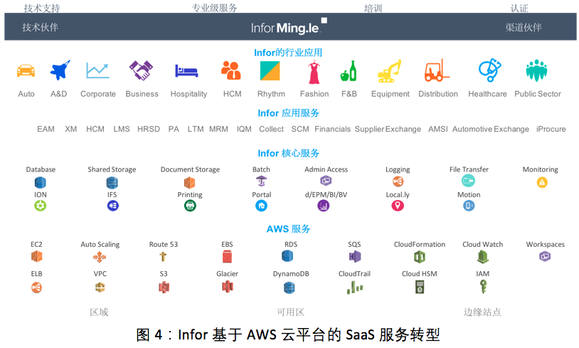 其中传统的ERP厂商Infor的成功的SaaS转型让人尤为印象深刻,Infor公司利用AWS平台来部署Infor的产品CloudSuite,而不是完全由Infor自己打造ERP解决方案的基础架构,SaaS合作伙伴要专注于特定行业,打造具有行业特点的SaaS服务,解决这些行业企业解决方案最后一公里的问题,让客户在AWS云计算的基础上拥有完整的端到端的解决方案,避免了定制化的需求。 随着Infor的客户部署深度的、集成的、庞大的解决方案套件,为了推动在企业软件领域的创新,需要Infor团队快速的推出一个强大,可扩展,高效的架构SaaS服务CloudSuites,而AWS平台提供了理想的选择。