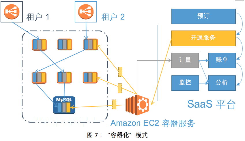 基于AWS的SaaS第二种推荐模式是“容器化”模式,这种模式是在“资源隔离”模式的基础上发展而来,使用目前业界应用越来越广的“容器”技术对资源进行隔离,而不是通过EC2虚拟化的方式对资源进行隔离。现在流行的“容器”技术对于计算资源的隔离方式提供了新的选择,有很多的ISV已经开始对自己的产品进行容器化的改造,将自己产品的一些服务“微服务”化,进行了拆分和Docker化的发布。由于AWS本身对于容器技术的基础型支撑非常完备,因此我们也推荐合作伙伴通过“容器化”的模式进行SaaS化的改造。采用了“容器化”的模式更容易利用目前Docker的生态,使用更多的技术实现DevOps、持续集成和持续部署等现代化改造。AWS的Amazon EC2 Container Service(Amazon ECS)是高扩展性、快速的管理容器集群的服务,可以运行、停止和管理在EC2实例上Docker容器集群,通过简单的API调用启动和停止基于容器的应用,允许通过集中的服务读取集群的状态并与很多Amazon EC2的功能进行集成。合作伙伴可以将自己已经经过容器化改造的服务快速的部署到Amazon ECS中进行集群管理,并通过容器自身的隔离机制实现各个租户资源的隔离。“容器化”的模式可以同样在一定程度上实现了“资源共享”的目的,实现了租户之间“进程”级的资源隔离,并将现代化的微服务的概念引入到原有的技术架构中,但同样也面临着各种挑战,特别是新引入进来的容器技术本身就会为变更管理、集群管理等之前的工作内容有非常大的变化同时复杂性也会大大增加。